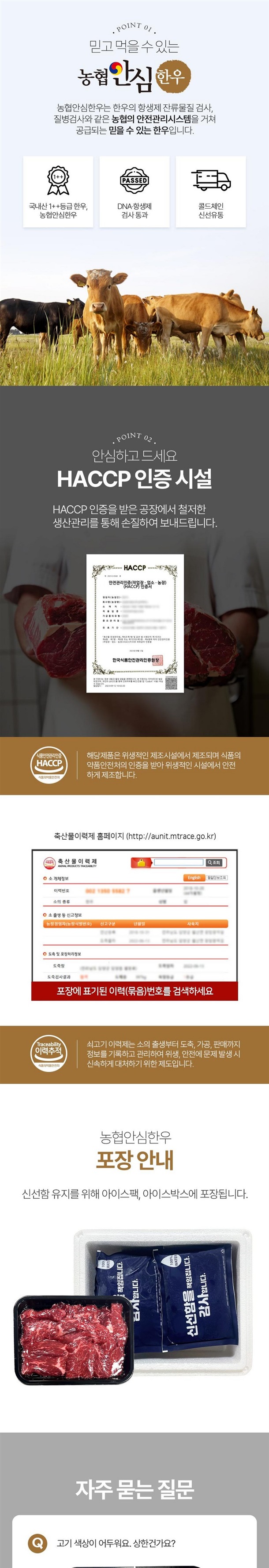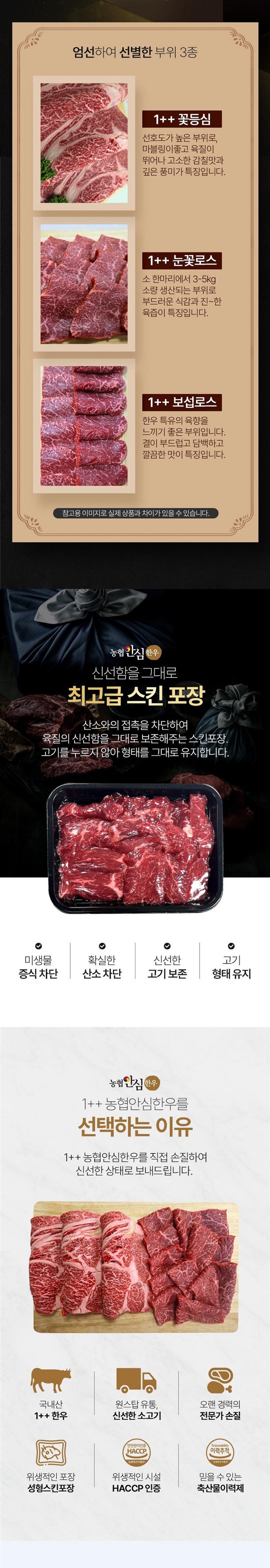 | 6-2. 축산물 - 「축산법」에 따른 등급 표시(1++ 등급 국내산 쇠고기의 경우 「소ㆍ돼지 식육의 표시방법 및 부위 구분기준」에 따라 근내지방도 정보를 포함하여 표시), 「가축 및 축산물 이력 관리에 관한 법률」에 따른 이력관리대상축산물 유무 | 상품 상세페이지 참조 |