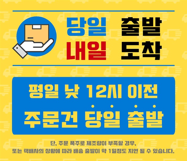 · 배송은 입금확인된 날짜로부터 1~3일 소요되며 최대 7일 이내 출고됩니다. ( 공휴일, 기상악화 등 불가피한 상황에 따라 추가 지연될 수 있습니다.)